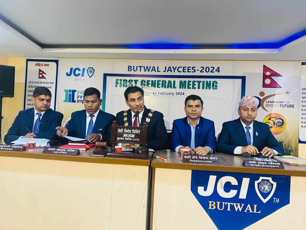 बुटवल जेसिज वर्ष २०२४ का अध्यक्ष जेसी विनोद घिमिरेको अध्यक्षतामा सम्पन्न प्रथम साधारणसभामा मिडिया संयोजक नारायण घिमिरे ” भावुक” को आस्था वाचन, पब्लिक रिलेसन डाइरेक्टर जेसी ओमहरी आचार्यको स्वागत मन्तव्य रहेको थियो । साधारण सभामा अध्यक्ष घिमिरेले वार्षिक कार्ययोजनाको प्रस्तुत गर्नुभएको थियो भने कोषाध्यक्ष यदुमणी पोख्रेलले वार्षिक प्रस्तावित आयव्याय प्रस्तुत गर्नुभएको थियो । त्यसैगरी महाहासचिव जेसी केशव श्रीसले साधारण सभामा प्रस्तावहरु प्रस्तुत गर्नुभएको थियो । सभामा १० जनाले १ मिनेट ३० सेकेन्डमा आफ्नो बिज्नेस प्रमोसन प्रस्तुत समेत गर्नुभएको थियो । र अन्त्यमा जेसी रमेश पाण्डे ज्यूको धन्यवाद मन्तव्य पश्चात् प्रथम साधारणसभा समापन भएको थियो ।